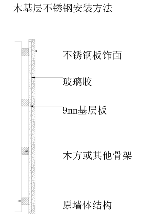 木基層的安裝方法:工序復(fù)雜,要請(qǐng)木工和不銹鋼板安裝工,這樣交叉工作人工成本高,而且板面太大做不平整,效果不好。